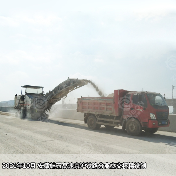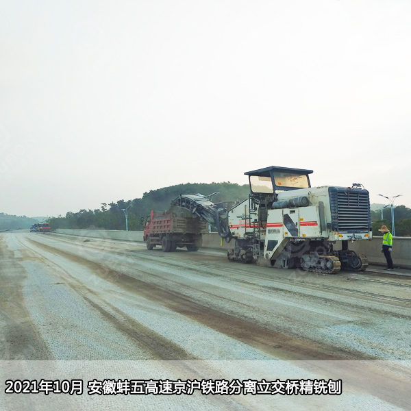 精銑刨施工正在火熱施工中,為蚌五高速早日通車,筑邦施工人員們兩班倒,以每天銑刨面積約15000㎡的速度進行著。